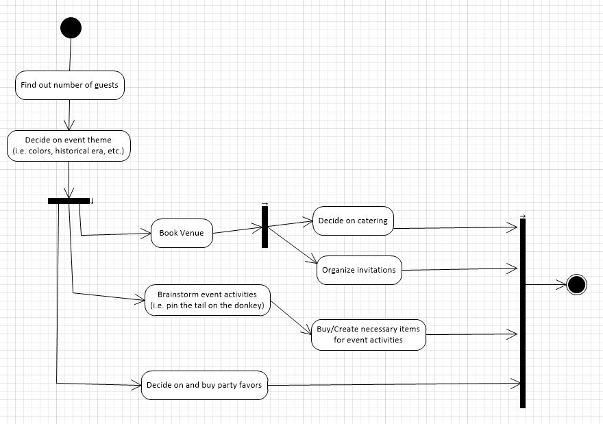 You have been asked to develop a system that will help with planning large-scale events and parties such as weddings, graduation celebrations, and birthday parties. Using an activity diagram, model the process context for such a system that shows the activities involved in planning a party (booking a venue, organizing invitations, etc.) and the system elements that might be used at each stage.