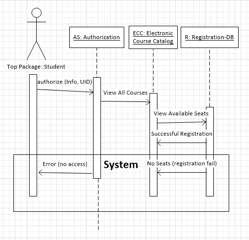 Develop a sequence diagram showing the interactions involved when a student registers for a course in a university. Courses may have limited enrollment, so the registration process must include checks that places are available. Assume that the student accesses an electronic course catalog to find out about available courses.