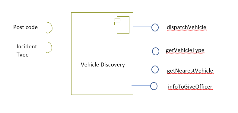 Design the interfaces of components that might be used in a system for an emergency control room. You should design interfaces for a call-logging component that records calls made, and a vehicle discovery component that, given a post code (zip code) and an incident type, finds the nearest suitable vehicle to be dispatched to the incident.